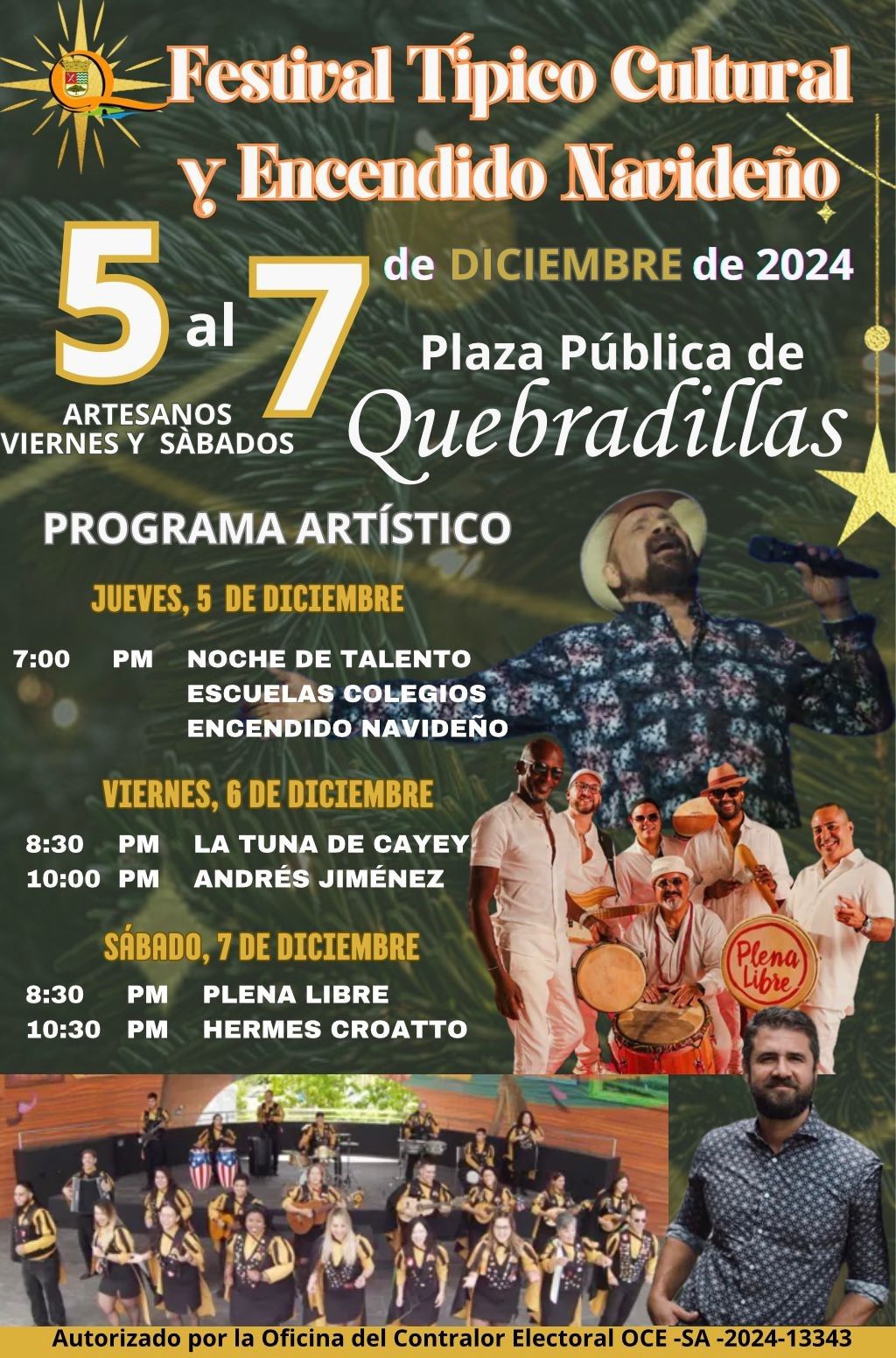 Enjoy at the Quebradillas Town Square with La Tuna de Cayey, Plena Libre, Andrés Jiménez, Hermes Croatto, and more.